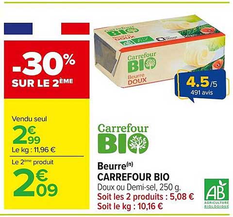 Offre de Beurre Carrefour Bio chez Carrefour