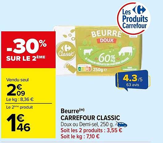 Découvrez la superbe offre de Beurre(M) Carrefour Classic dans le nouveau catalogue de Carrefour. En plus de cette offre, vous trouverez de nombreuses autres réductions attrayantes. Vous pouvez facilement commander le Beurre(M) Carrefour Classic en ligne via le site web de Carrefour ou l'acheter dans un magasin près de chez vous.