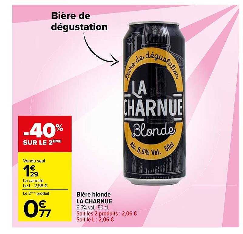 Découvrez dès maintenant la offre Bière blonde LA CHARNUE dans le catalogue de Carrefour. Cette offre est valable du 12/11/2024 au 25/11/2024.