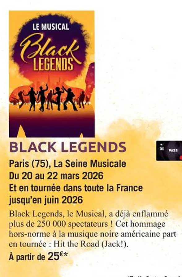 Préparez-vous à plonger dans l'univers vibrant de Black Legends ! Ce musical incontournable rend hommage à la musique noire américaine et fait vibrer plus de 250 000 spectateurs à travers la France. Avec des performances éblouissantes, Black Legends vous invite à vivre une expérience unique qui vous transportera du 20 au 22 mars 2026 à La Seine Musicale, et en tournée jusqu'en juin 2026. Ne manquez pas cette occasion de découvrir un spectacle qui réchauffe le cœur et célèbre la culture.