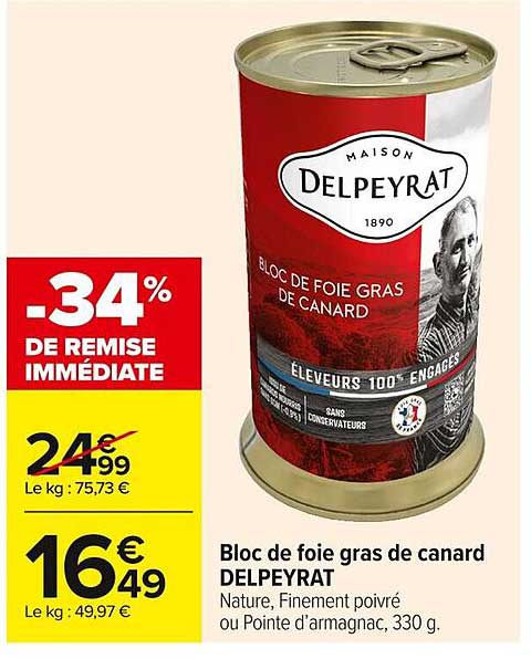 Découvrez dès maintenant la offre Bloc de foie gras de canard DELPEYRAT dans le catalogue de Carrefour. Cette offre est valable du 08/04/2025 au 21/04/2025.