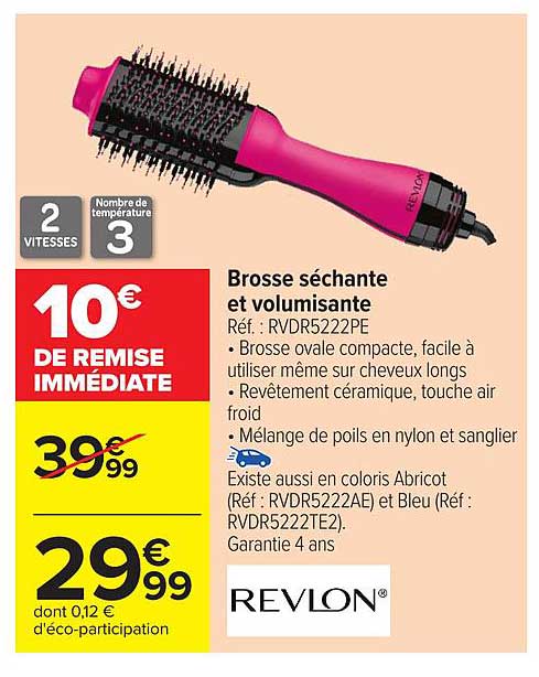 Découvrez la brosse séchante et volumisante de Revlon, l'alliée idéale pour obtenir des coiffures élégantes et volumineuses sans effort. Disponible à un prix exceptionnel sur cette page, cette brosse facilite le séchage et le coiffage en un seul geste. Profitez de cette offre exceptionnelle, valable du 7 au 20 octobre 2025.