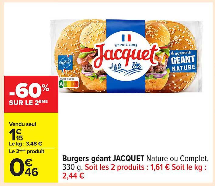 Découvrez une offre alléchante sur les Burgers géant JACQUET, désormais disponibles à un prix exceptionnel. Profitez d'une réduction de 60% sur le deuxième produit, une opportunité parfaite pour les amateurs de bons repas. Que ce soit pour un barbecue entre amis ou un dîner en famille, ces burgers sont idéaux !