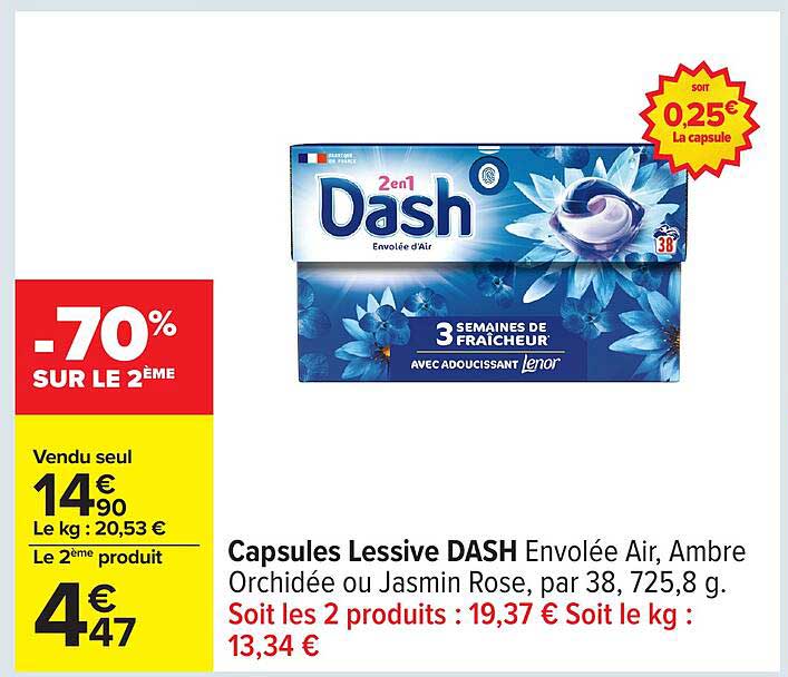 Découvrez l'offre exceptionnelle sur les Capsules Lessive DASH, disponibles en Envolée Air, Ambre Orchidée ou Jasmin Rose. Ces capsules pratiques vous garantissent une propreté éclatante tout en laissant vos vêtements délicatement parfumés. Du 2 au 15 décembre 2025, profitez de cette opportunité incroyable pour simplifier vos tâches de blanchisserie.