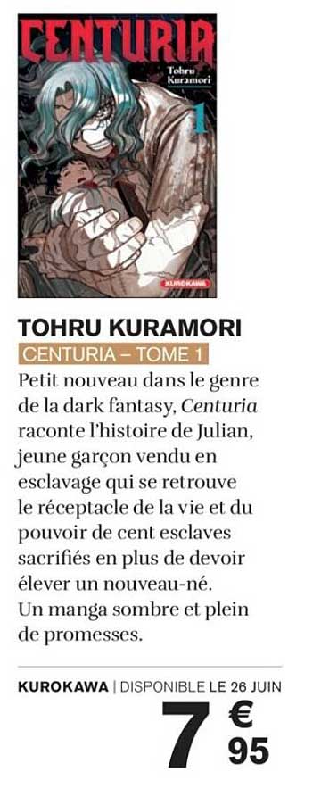 Découvrez le premier tome de Centuria, une œuvre captivante de Tohru Kuramori qui vous plonge dans un univers de dark fantasy. Ce manga, disponible à un prix très attractif, vous fera vivre l'histoire de Julian, un jeune garçon dont la vie bascule lorsqu'il est vendu en esclavage. Avec une narration immersive et une illustration soignée, ce tome promet d'être un véritable coup de cœur pour les amateurs du genre.