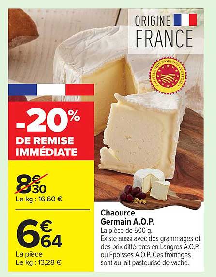 Découvrez dès maintenant la offre Chaource Germain A.O.P. dans le catalogue de Carrefour. Cette offre est valable du 01/04/2025 au 14/04/2025.