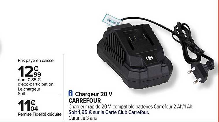 Découvrez notre promotion exceptionnelle sur le chargeur rapide 20 V de Carrefour, idéal pour recharger vos batteries Carrefour 2 Ah/4 Ah. Cette offre limitée est valable jusqu'au 13 octobre 2025, alors ne manquez pas cette chance d'optimiser vos séances de bricolage avec cet accessoire indispensable.