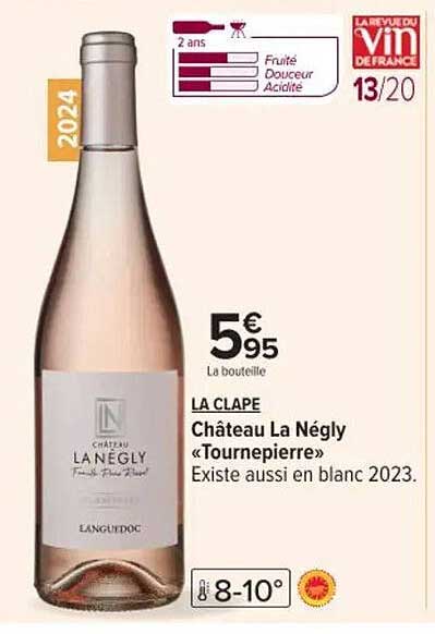 Découvrez le Château La Négly « Tournepierre », un vin rosé d'exception qui saura ravir vos papilles. Avec son prix de seulement 5,95 €, cette bouteille est un choix idéal pour vos repas entre amis ou en famille. Profitez de ce vin dans la période du 8 au 21 avril 2025, une occasion à ne pas manquer !