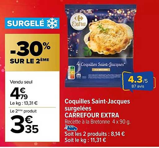 Découvrez l'offre de Coquilles Saint-Jacques Surgelées chez Carrefour! Cette offre fantastique est maintenant disponible dans le nouveau catalogue de Carrefour. Profitez de cette occasion et économisez considérablement sur votre achat.