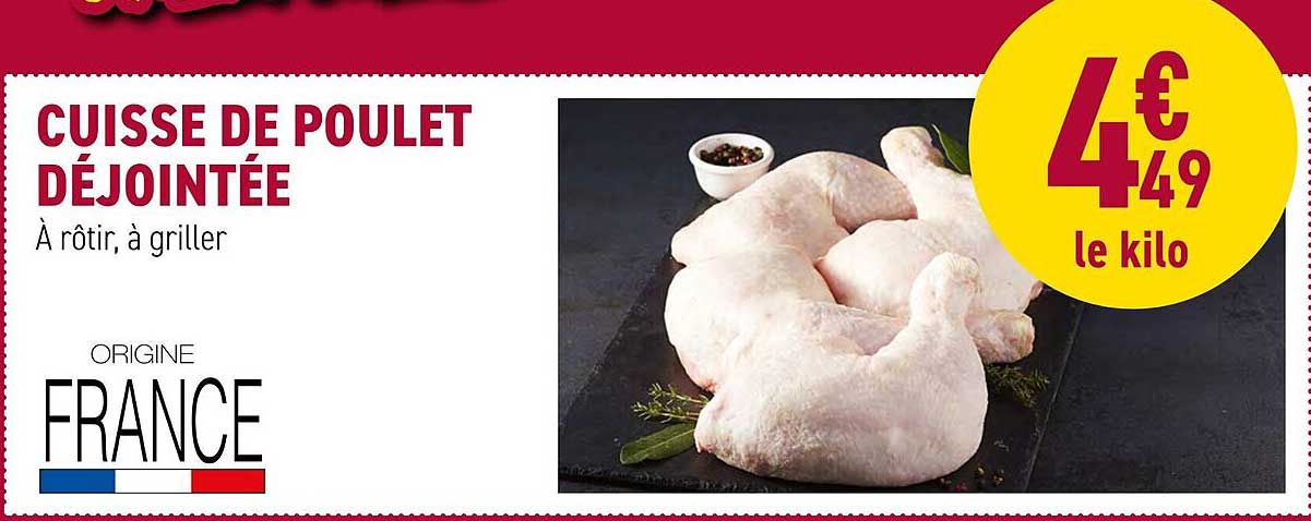 Découvrez l'offre de Cuisse De Poulet Déjointee chez Carrefour! Cette offre fantastique est maintenant disponible dans le nouveau catalogue de Carrefour. Profitez de cette occasion et économisez considérablement sur votre achat.