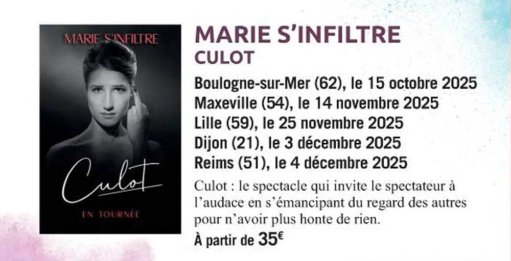 Marie S'infiltre est reconnue pour son humour incisif et sa capacité à captiver son public. Les représentations auront lieu dans plusieurs villes telles que Boulogne-sur-Mer, Maxéville, et Lille, entre autres. Chaque spectacle est une promesse d'énergie et d'engagement, offrant ainsi une expérience mémorable.