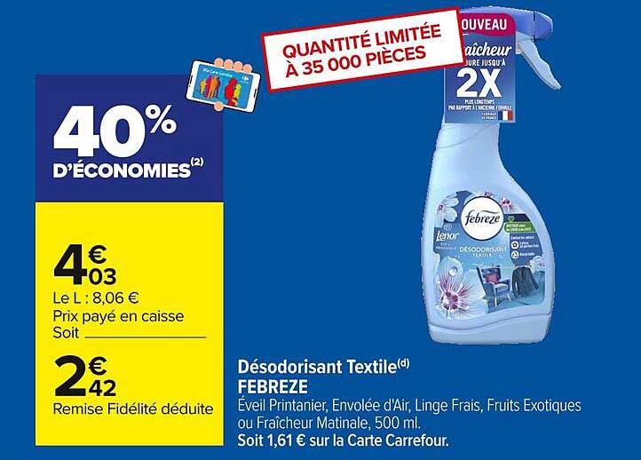 Découvrez l'offre de Désodorisant Textile(D) Febreze chez Carrefour! Cette offre fantastique est maintenant disponible dans le nouveau catalogue de Carrefour. Profitez de cette occasion et économisez considérablement sur votre achat.