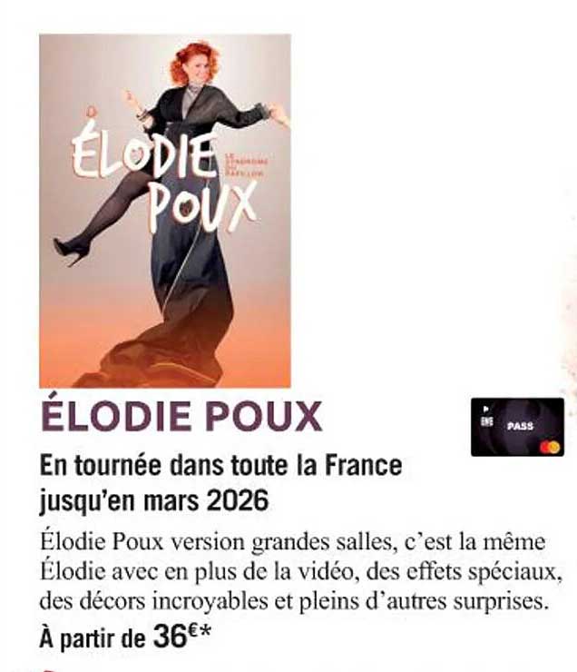 Découvrez le tout nouveau spectacle d'Élodie Poux, en tournée dans toute la France jusqu'en mars 2026. Un spectacle unique qui promet de vous faire rire aux éclats ! Ne manquez pas cette occasion de vivre une expérience inoubliable dans une version enrichie, avec des vidéos et des effets spéciaux qui ajoutent une dimension spectaculaire à l'humour de l'artiste.