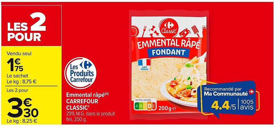 Découvrez l'offre de Emmental Râpé Carrefour Classic' chez Carrefour! Cette offre fantastique est maintenant disponible dans le nouveau catalogue de Carrefour. Profitez de cette occasion et économisez considérablement sur votre achat.