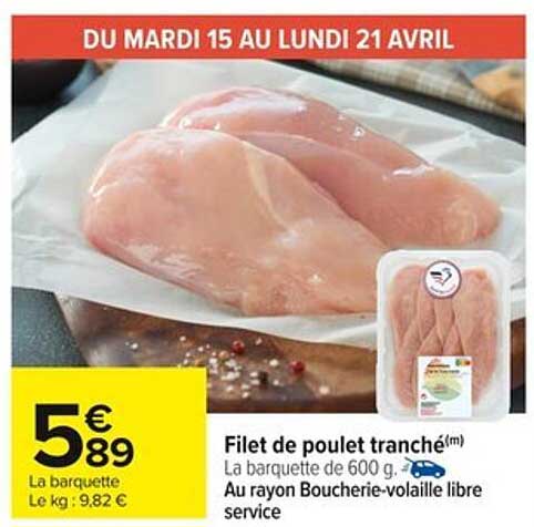Découvrez dès maintenant la offre Filet de poulet tranché dans le catalogue de Carrefour. Cette offre est valable du 15/04/2025 au 28/04/2025.