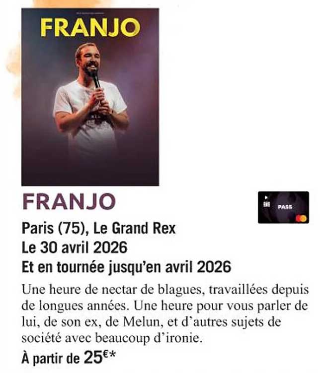 Ne manquez pas l'occasion de découvrir l'humour unique de Franjo, qui se produira au Grand Rex à Paris le 30 avril 2026. Sa performance, pleine de plaisanteries aiguisées, offre une heure de rires et de réflexions sur des sujets variés, allant de l'amour aux anecdotes personnelles.
