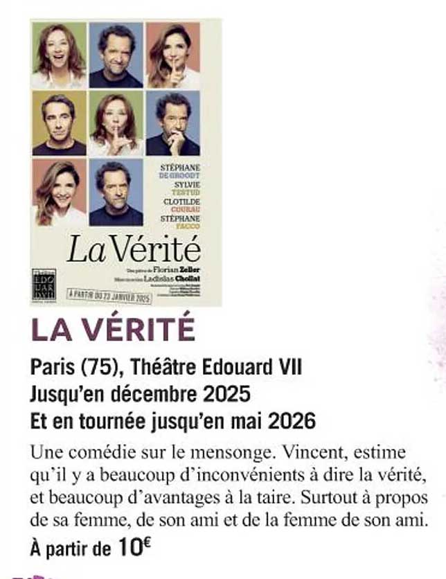 Ne ratez pas l'occasion d'assister à "La Vérité", une comédie palpitante qui questionne les notions de sincérité et de mensonge. Présentée au Théâtre Edouard VII à Paris, cette pièce met en scène Vincent, un homme qui lutte avec les conséquences de dire la vérité et de garder des secrets. Avec des performances captivantes, c'est un spectacle qui saura vous divertir et vous faire réfléchir.