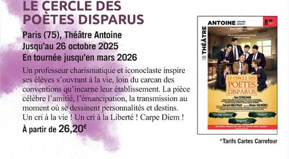 Plongez dans l'univers inspirant du célèbre spectacle "Le Cercle des Poètes Disparus" qui se joue au Théâtre Antoine à Paris. Cette offre est non seulement une opportunité de découvrir une œuvre emblématique du théâtre, mais aussi de vivre une expérience qui célèbre la vie, la liberté et l'amitié. Avec un prix d'entrée à partir de 26,20€, c'est une occasion à ne pas manquer !