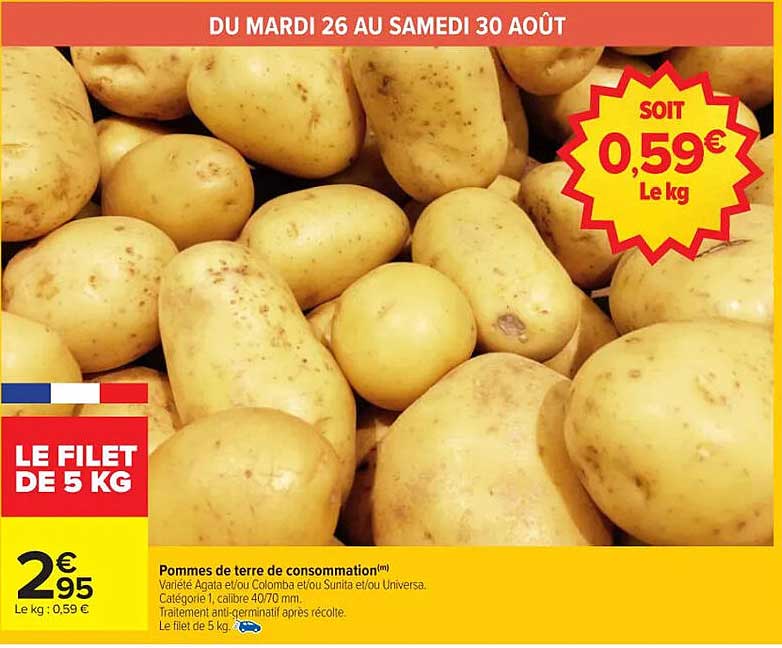 Découvrez notre incroyable promotion sur le filet de pommes de terre de consommation ! Du mardi 26 au samedi 30 août, profitez d'un prix exceptionnel de seulement 0,59 € le kg, une occasion à ne pas manquer pour garnir votre cuisine avec un produit de qualité.