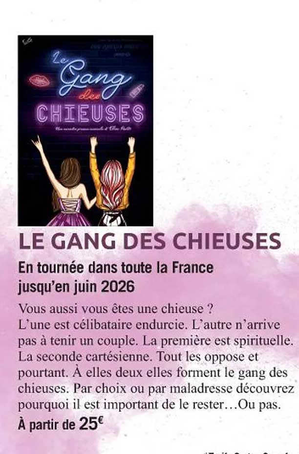 Découvrez la comédie dynamique "Le Gang des Chieuses" en tournée dans toute la France jusqu'en juin 2026. Cette pièce met en lumière des personnages hauts en couleur, chacun avec ses propres défis et sa façon unique de vivre l'amour et l'amitié. Ne manquez pas cette opportunité de rire et de vous identifier aux situations rocambolesques de ces deux amies que tout oppose !