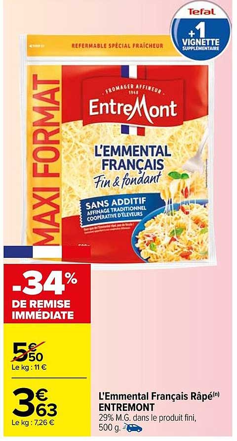 Découvrez l'offre de L'emmental Français Râpé(N) Entremont chez Carrefour! Cette offre fantastique est maintenant disponible dans le nouveau catalogue de Carrefour. Profitez de cette occasion et économisez considérablement sur votre achat.