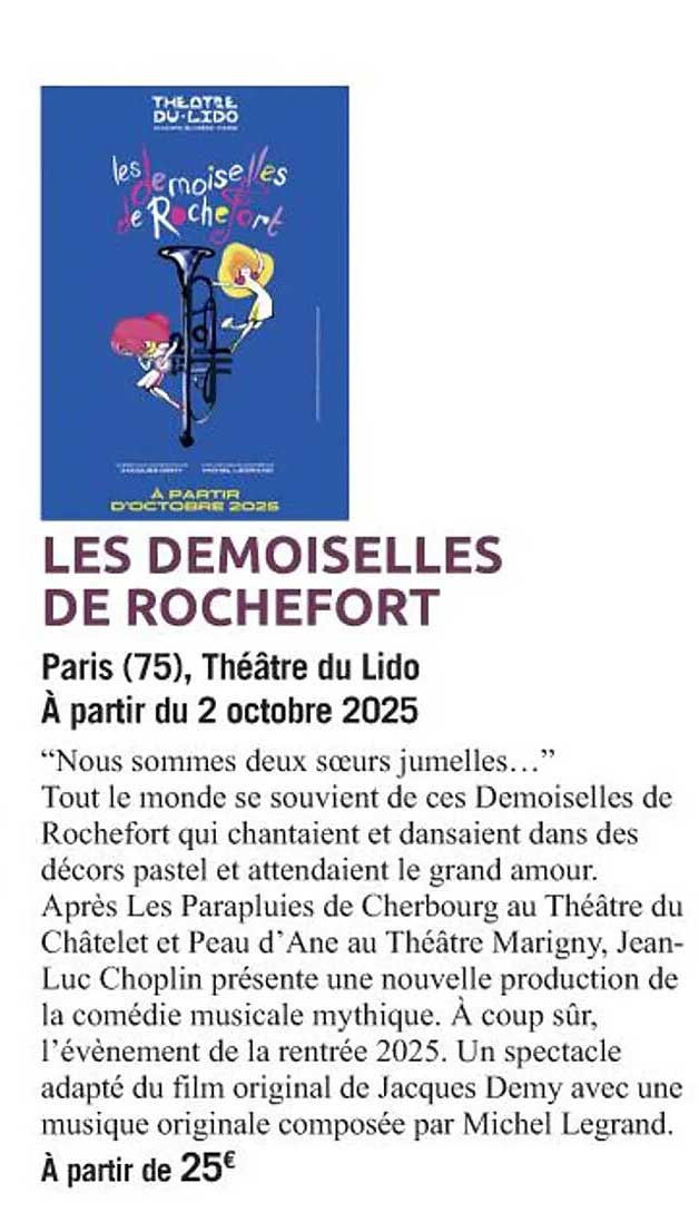 Vous êtes prêts pour un voyage inoubliable dans l'univers enchanteur des Demoiselles de Rochefort ? À partir du 2 octobre 2025, le Théâtre du Lido à Paris vous propose de plonger dans cette comédie musicale mythique, pleine de mélodies envoûtantes et de décors pastel. Une belle occasion de redécouvrir l'histoire magique de ces sœurs jumelles qui rêvent d'amour et d'aventure.