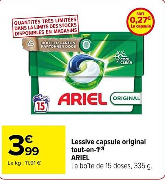 Découvrez dès maintenant la offre Lessive capsule original tout-en-1(d) ARIEL dans le catalogue de Carrefour. Cette offre est valable du 26/03/2025 au 06/04/2025.