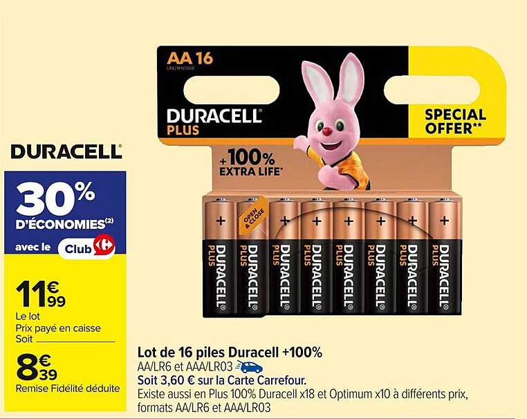 Découvrez l'offre de Lot De 16 Piles Duracell +100% chez Carrefour! Cette offre fantastique est maintenant disponible dans le nouveau catalogue de Carrefour. Profitez de cette occasion et économisez considérablement sur votre achat.