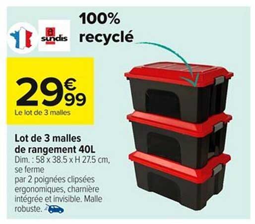Découvrez ce lot de 3 malles de rangement de 40L, idéales pour organiser votre maison ou votre garage. À un prix très attractif de 29,99 €, ces malles allient fonctionnalité et design, tout en étant 100% recyclées. C'est une offre incontournable pour ceux qui cherchent des solutions de rangement pratiques.