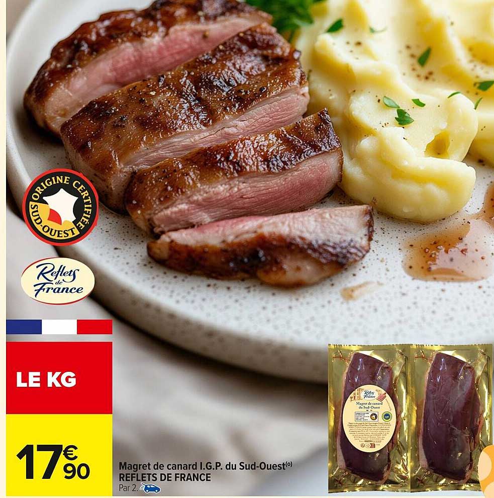 Découvrez dès maintenant la offre Magret de canard I.G.P. du Sud-Ouest Reflets de France dans le catalogue de Carrefour. Cette offre est valable du 08/04/2025 au 21/04/2025.