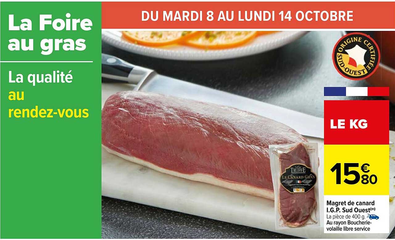 Découvrez l'offre de Magret De Canard I.g.p. Sud Ouest chez Carrefour! Cette offre fantastique est maintenant disponible dans le nouveau catalogue de Carrefour. Profitez de cette occasion et économisez considérablement sur votre achat.