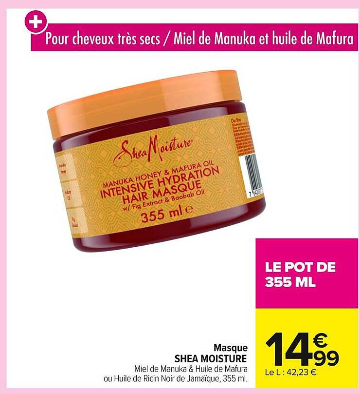 Découvrez le Masque Shea Moisture à base de Miel de Manuka et d'Huile de Mafura ! Ce produit est spécialement conçu pour hydrater en profondeur les cheveux très secs. Avec ses ingrédients enrichis, il promet de revitaliser votre chevelure tout en lui apportant douceur et éclat. Une excellente occasion pour prendre soin de vos cheveux tout en profitant d'une promotion avantageuse !