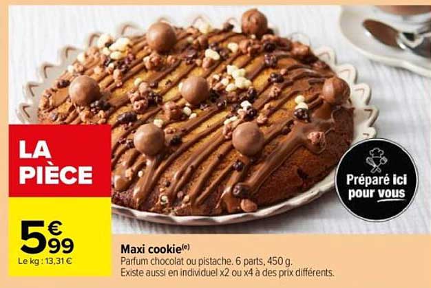 Les amateurs de douceurs seront comblés avec notre promotion sur le délicieux Maxi cookie, disponible chez Carrefour. Avec un poids de 450 g, ce cookie se décline en saveurs gourmandes : chocolat et pistache. Parfait pour partager en famille ou entre amis, il est découpé en 6 parts, idéal pour un goûter ou un dessert. Ne manquez pas cette occasion de vous faire plaisir à prix réduit !