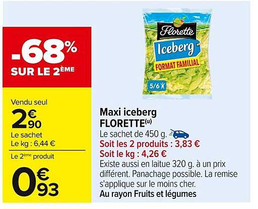 Découvrez l'offre de Maxi Iceberg Florette chez Carrefour! Cette offre fantastique est maintenant disponible dans le nouveau catalogue de Carrefour. Profitez de cette occasion et économisez considérablement sur votre achat.