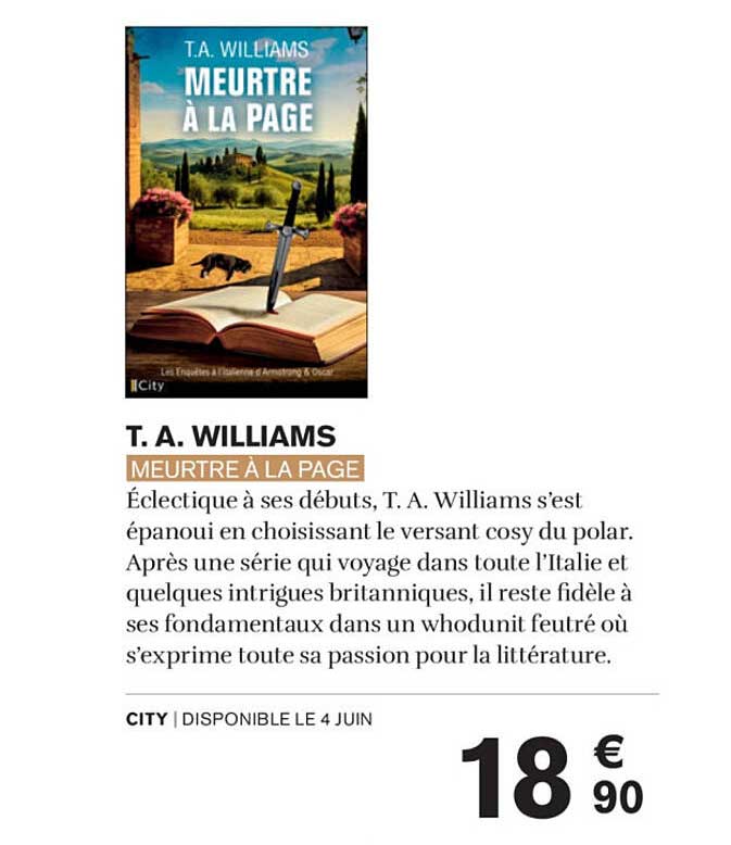 Découvrez 'Meurtre à la page' de T. A. Williams, un roman qui plonge ses lecteurs dans un univers à la fois captivant et plein de mystères. Profitez de cette promotion exceptionnelle disponible jusqu'au 30 juin 2025, une occasion idéale d'ajouter à votre bibliothèque ce thriller littéraire où le polar rencontre la passion de la littérature.