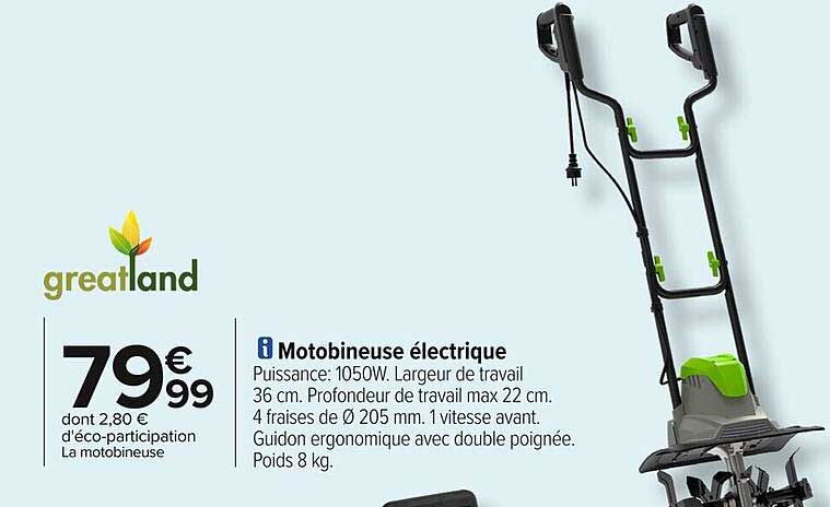 La motobineuse électrique de Greatland est l'outil idéal pour préparer votre jardin et obtenir un sol aéré et prêt à accueillir vos plantations. Avec une puissance de 1050W, elle vous permettra de travailler efficacement sans effort. Profitez de cette offre exceptionnelle, valable du 30 septembre au 13 octobre 2025, pour améliorer votre jardin comme un pro.