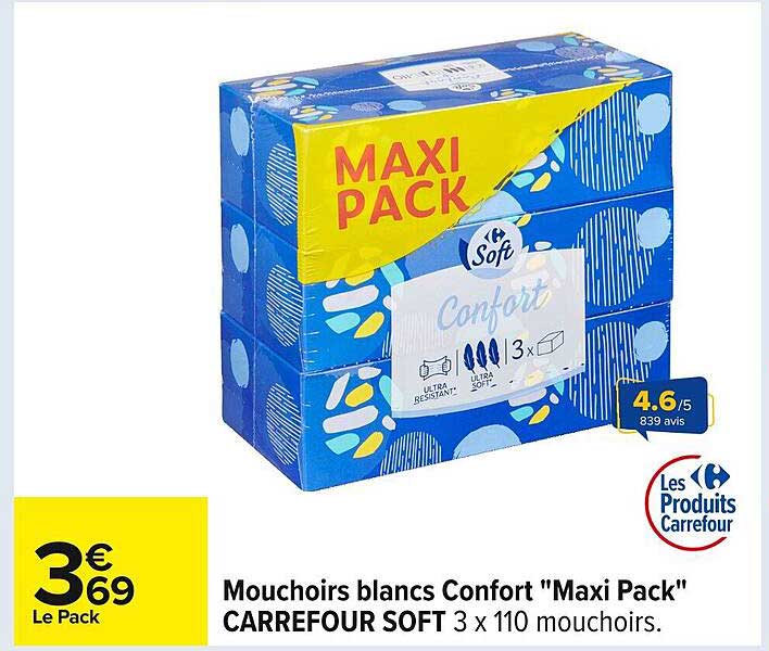 Découvrez dès maintenant la offre Mouchoirs blancs Confort "Maxi Pack" dans le catalogue de Carrefour. Cette offre est valable du 30/09/2025 au 13/10/2025.