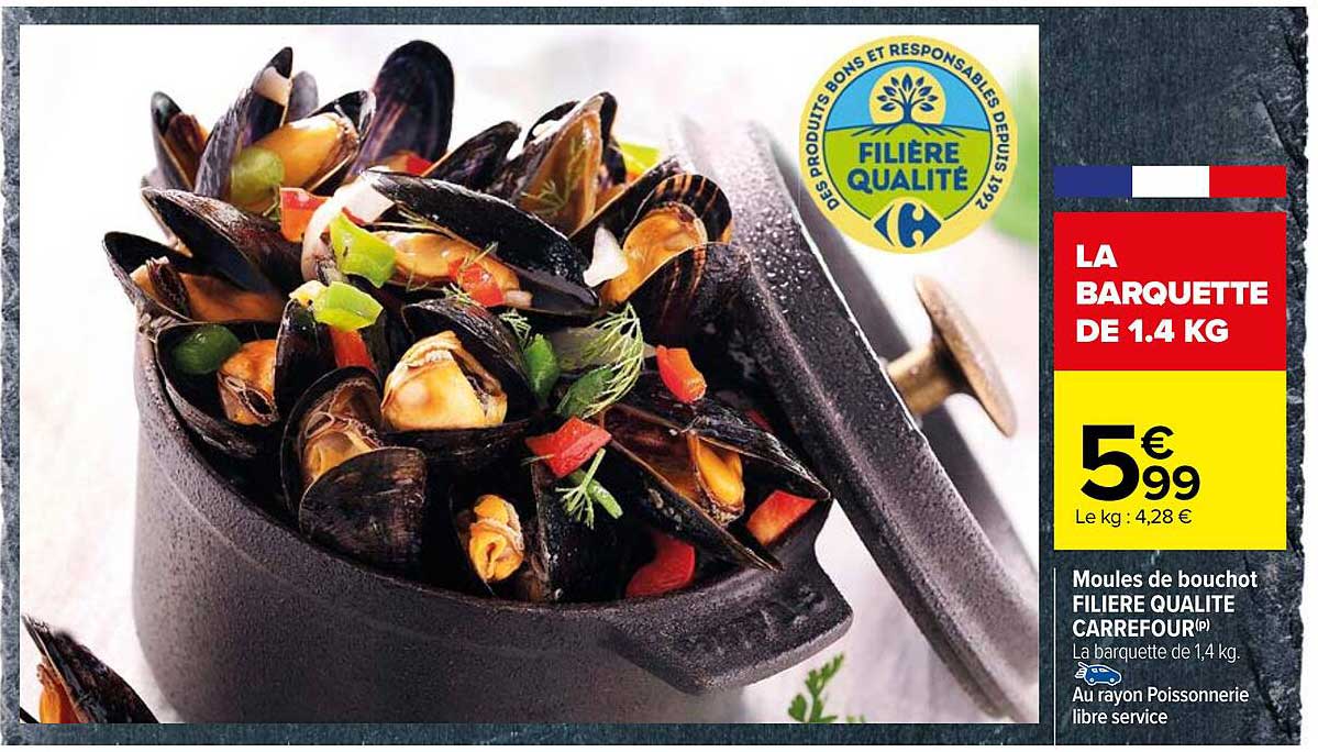 Découvrez dès maintenant la offre Moules de bouchot FILIÈRE QUALITÉ CARREFOUR dans le catalogue de Carrefour. Cette offre est valable du 22/10/2024 au 04/11/2024.