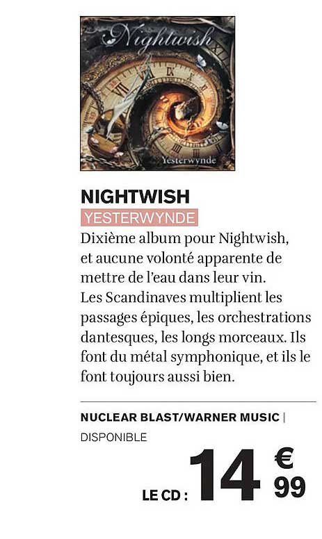 Découvrez dès maintenant la offre NIGHTWISH YESTERWYNDE dans le catalogue de Carrefour. Cette offre est valable du 01/11/2024 au 30/11/2024.