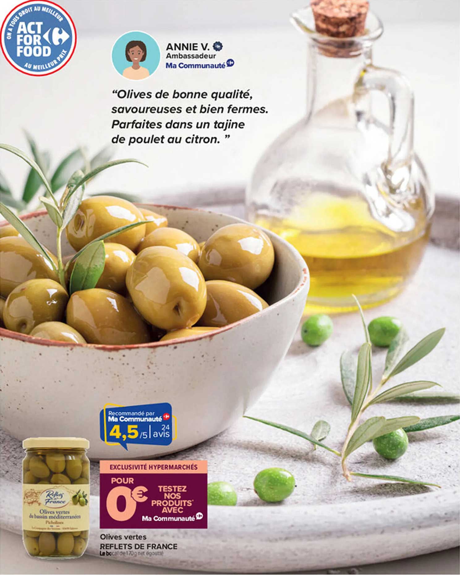 Découvrez une offre exceptionnelle sur les olives vertes Reflets de France, disponibles en exclusivité dans les hypermarchés Carrefour. Ces olives, appréciées pour leur qualité et leur goût savoureux, sont parfaites pour agrémenter vos plats méditerranéens ou vos apéritifs entre amis.