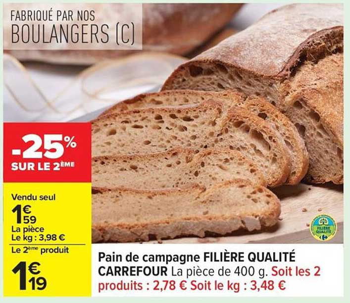 Découvrez dès maintenant la offre Pain de campagne FILIÈRE QUALITÉ CARREFOUR dans le catalogue de Carrefour. Cette offre est valable du 18/11/2025 au 01/12/2025.