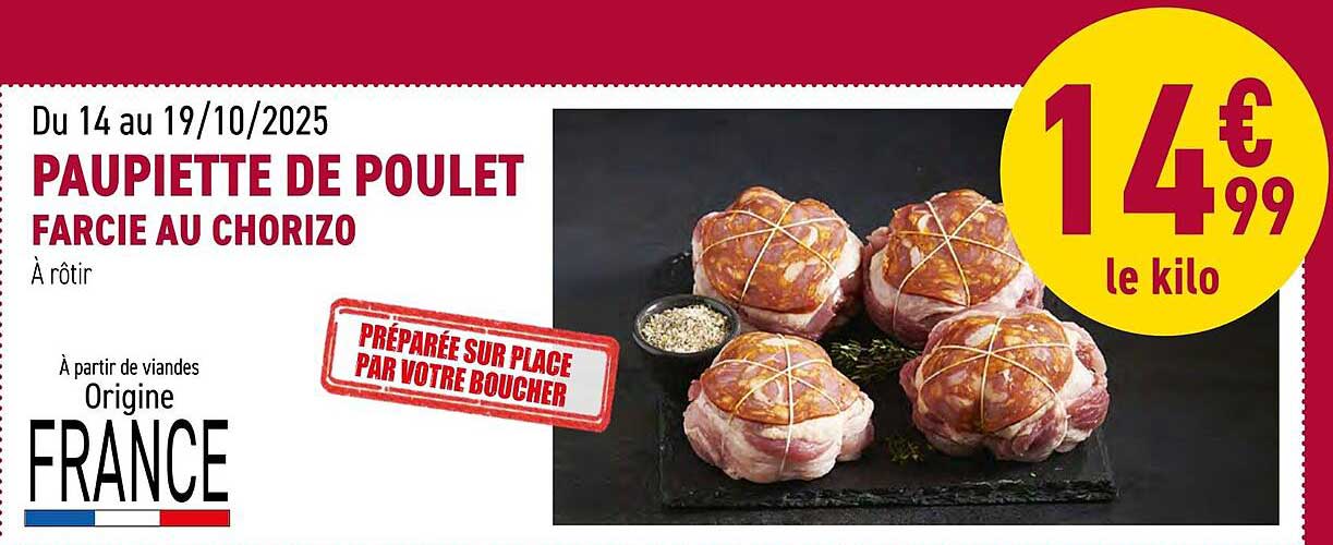 Découvrez dès maintenant la offre PAUPIETTE DE POULET FARCIE AU CHORIZO dans le catalogue de Carrefour. Cette offre est valable du 14/10/2025 au 26/10/2025.