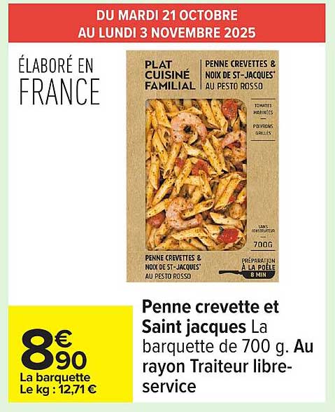 Découvrez dès maintenant la offre Penne crevette et Saint jacques dans le catalogue de Carrefour. Cette offre est valable du 21/10/2025 au 03/11/2025.