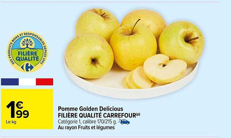 Découvrez l'offre de Pomme Golden Delicious Filière Qualité Carrefour chez Carrefour! Cette offre fantastique est maintenant disponible dans le nouveau catalogue de Carrefour. Profitez de cette occasion et économisez considérablement sur votre achat.