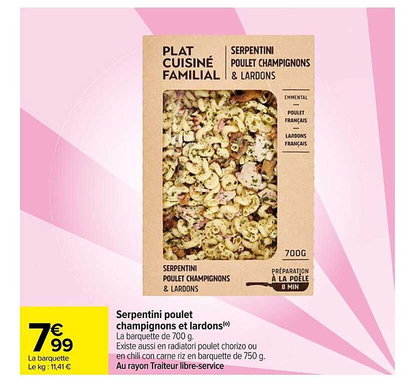 Découvrez l'offre de Serpentini Poulet Champignons & Lardons chez Carrefour! Cette offre fantastique est maintenant disponible dans le nouveau catalogue de Carrefour. Profitez de cette occasion et économisez considérablement sur votre achat.