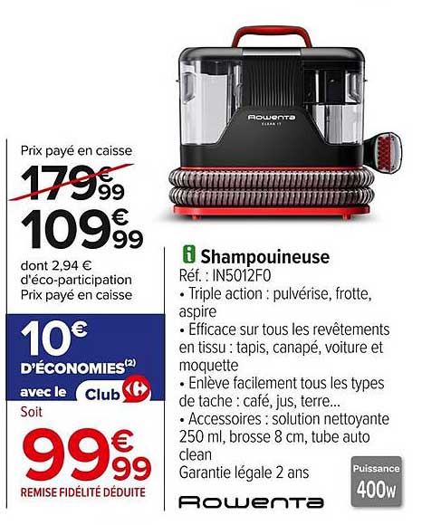 Découvrez la shampooneuse Rowenta, un appareil indispensable pour garder vos tissus impeccables. Profitez d'une offre exceptionnelle valable jusqu'au 20 octobre 2025 et transformez votre entretien intérieur. Avec sa triple action, elle pulvérise, frotte et aspire, offrant ainsi une propreté inégalée.