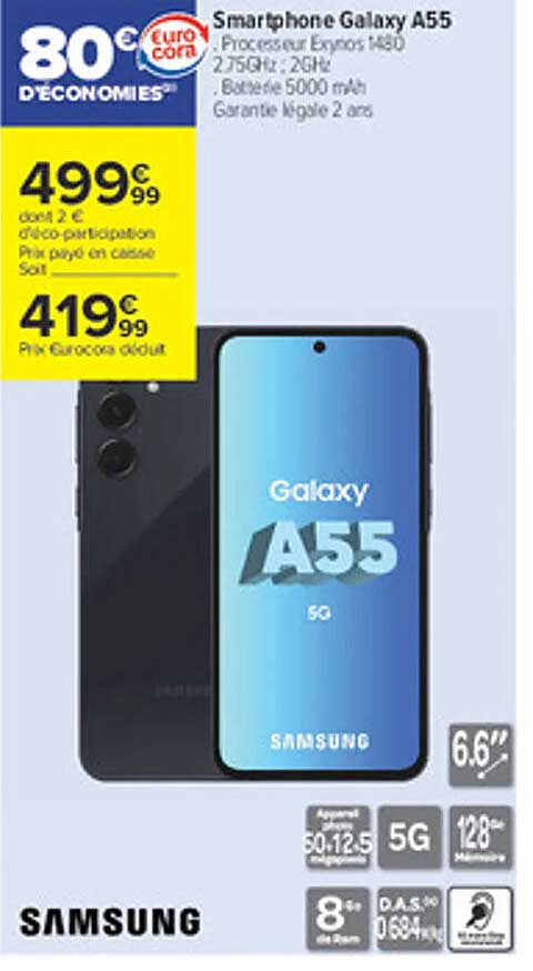 Découvrez l'offre de Smartphone Galaxy A55 5G chez Carrefour! Cette offre fantastique est maintenant disponible dans le nouveau catalogue de Carrefour. Profitez de cette occasion et économisez considérablement sur votre achat.