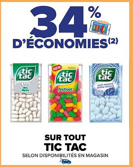 Découvrez l'offre de Sur Tout Tic Tac chez Carrefour! Cette offre fantastique est maintenant disponible dans le nouveau catalogue de Carrefour. Profitez de cette occasion et économisez considérablement sur votre achat.