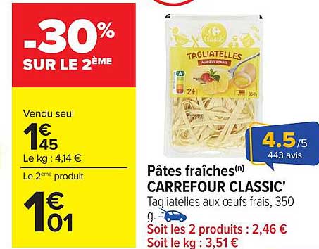 Découvrez l'offre de Tagiatelles Aux Œufs Frais, 350 G. chez Carrefour! Cette offre fantastique est maintenant disponible dans le nouveau catalogue de Carrefour. Profitez de cette occasion et économisez considérablement sur votre achat.