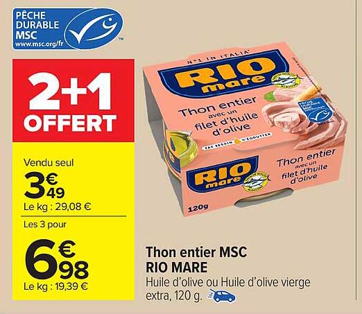 Découvrez dès maintenant la offre Thon entier MSC RIO MARE dans le catalogue de Carrefour. Cette offre est valable du 25/03/2025 au 07/04/2025.